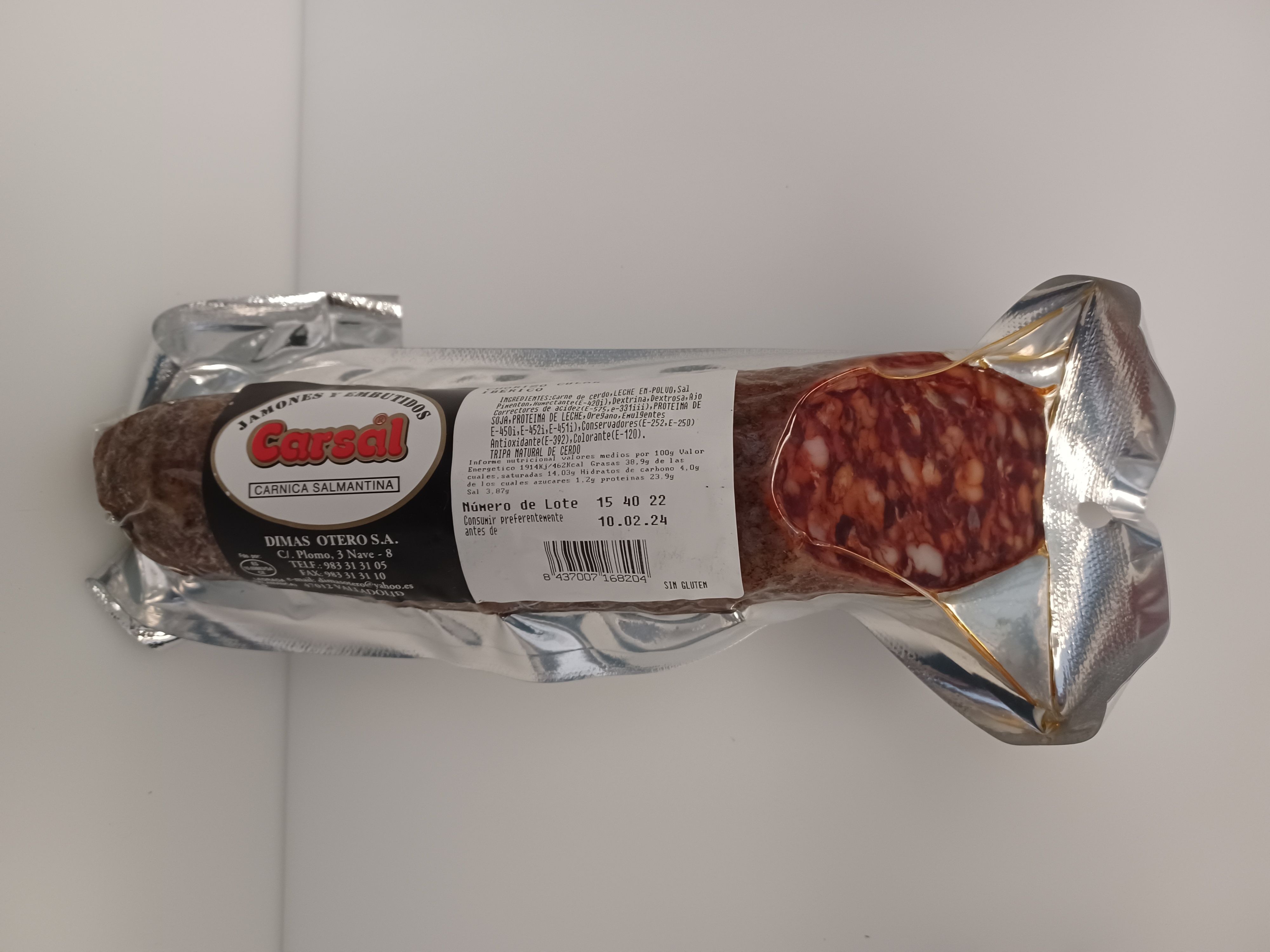 Ingredientes: Carne de cerdo, leche en polvo, sal, pimentón, humectante (E-420), dextrina, dextrosa, ajo, correctores de acidez (E-575, E-331iii), proteína de soja, proteína de leche, orégano, emulgentes (E-450, E-452i y E-451i), conservadores (E-252, E-250), antioxidante (E-392) y colorante (E-120).