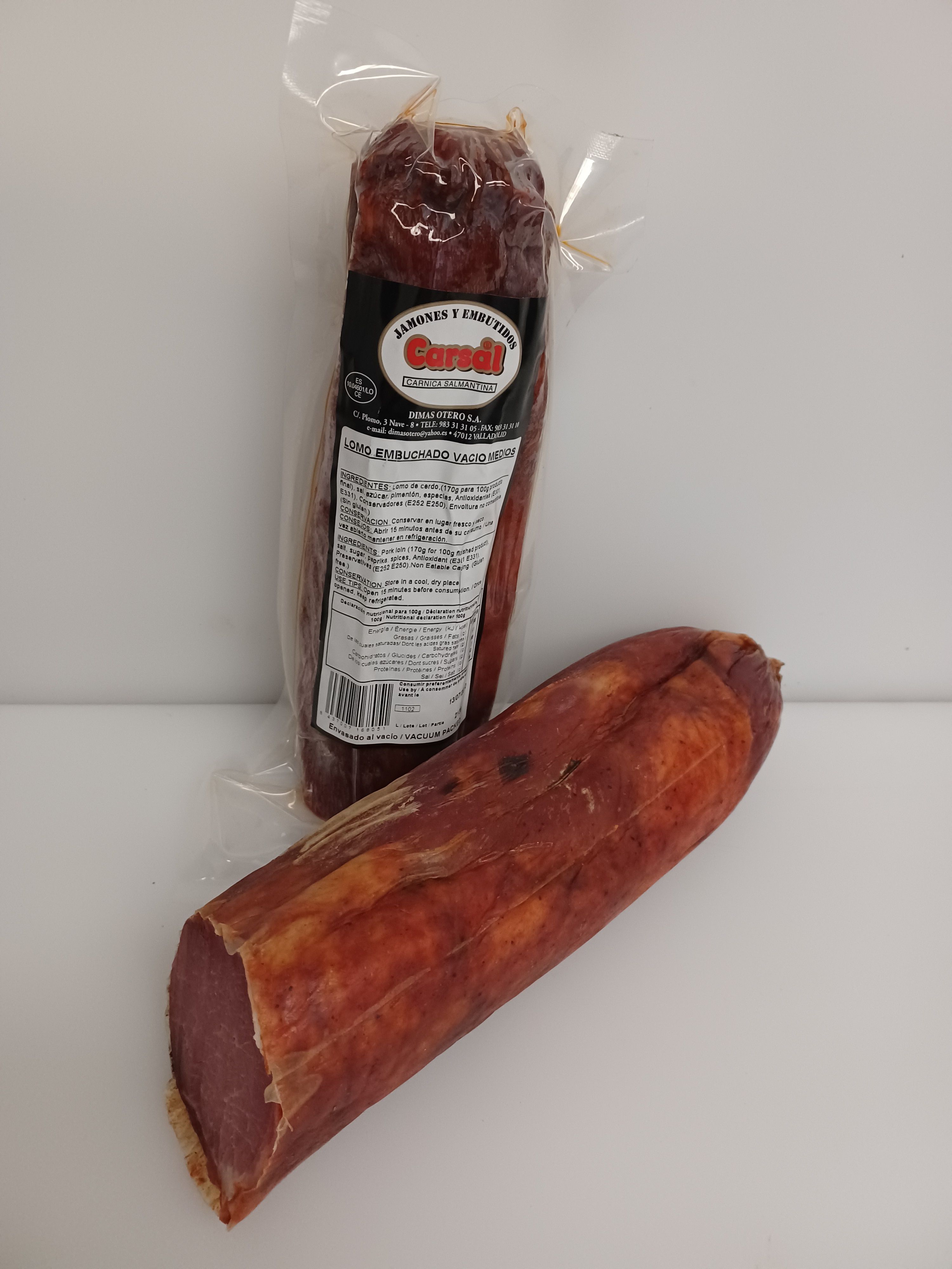 Ingredientes: Lomo de cerdo (170 gr. para 100 gr. de producto final), sal, azúcar, pimentón, especias, antioxidantes (E-301 y E-331). Conservadores (E-252, E-250 ajo). Tripa no comestible (sin gluten).