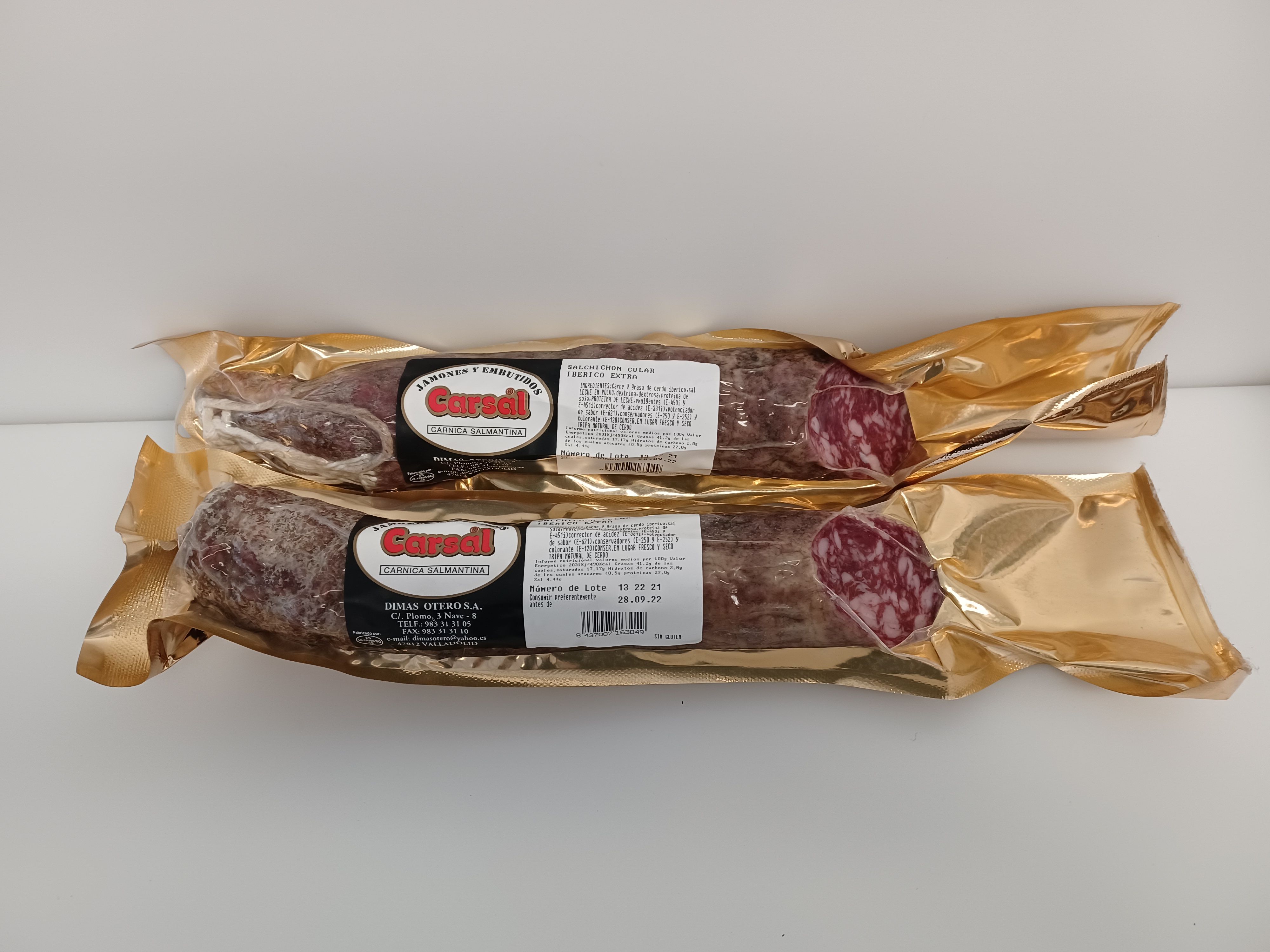 Ingredientes:Carne y grase de cerdo ibérico, sal, leche en polvo, dextrina, dextrosa, proteína de soja, proteína de leche, emulgentes (E-450 y E-451i), correctores de acidez (E-331i), potenciador de sabor (E-621), conservadores (E-250 y E-252) y colorantes (E-120). Tripa natural de cerdo.